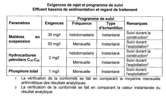 Description de projet – séparateurs eau/huile L'étude d'impact fournit peu d'information concernant les séparateurs eau/huile. Le ministère du Développement durable, de l'Environnement et de la Lutte contre les Changements climatiques note que les hydrocarbures pétroliers C10-C50 ne devraient pas dépasser 5 mg/L à la sortie des équipements, si le rejet s'effectue dans l'environnement. |