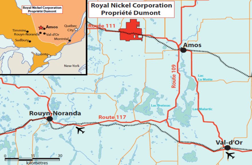 Royal Nickel Corporation projette d'exploiter un gisement nickélifère sur la propriété minière Dumont, située dans la municipalité régionale de comté d'Abitibi dans la région administrative de l'Abitibi-Témiscamingue. Le gisement se trouve à environ 25 km à l'ouest de la ville d'Amos.
