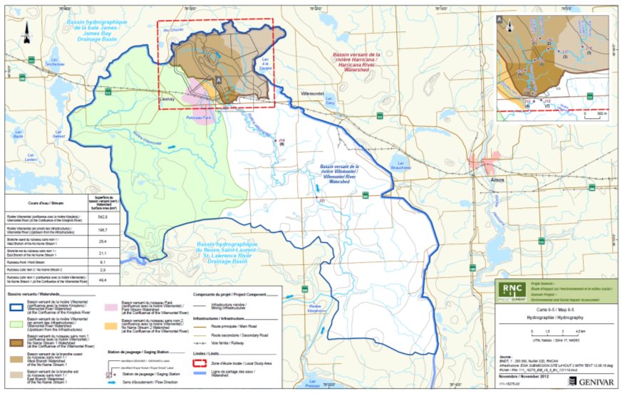 Sur la base des études qu'il a produites, le promoteur conclut que les activités liées à son projet n'auront aucun impact sur le bassin versant de la rivière Harricana. Le promoteur a précisé que les infrastructures minières sont toutes localisées à l'intérieur d'un seul bassin versant, soit le bassin de la rivière Villemontel. Le promoteur ne fera pas de suivi auprès de la Nation crie de Washaw Sibi, mais il réalisera un suivi pour évaluer l'impact de la qualité de l'eau sur le lac Chicobi et de la rivière du même nom, lesquels plans d'eau se drainent dans la rivière Harricana. Ce suivi permettra de valider l'absence d'effet négatif dans le bassin versant du lac Chicobi et donc dans la rivière Harricana. |