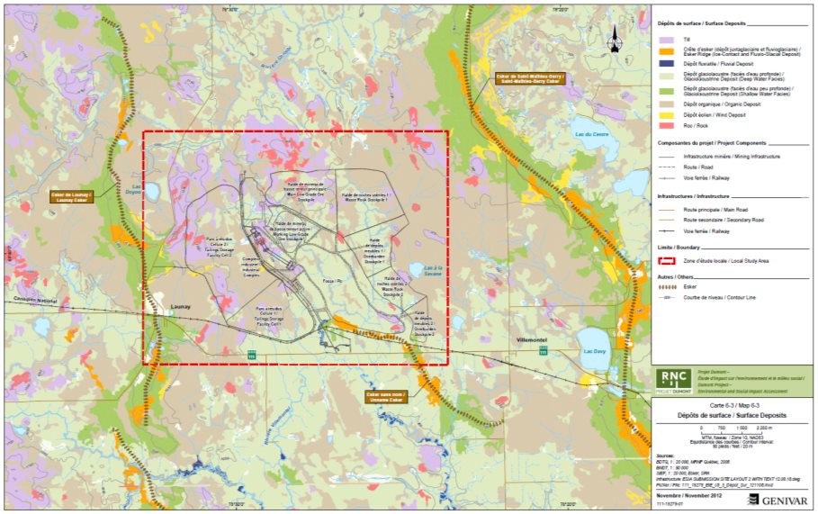 Les modélisations réalisées par le promoteur sur la qualité de l'air, les vibrations et le bruit concluent qu'avec les mesures d'atténuation (dont l'utilisation d'abats-poussières, de talus anti-bruit et de l'optimisation de la séquence d'initiation de sautage), il ne devrait pas y avoir d'effet perceptible au-delà de 2 km. En regard de la directive 019 du gouvernement du Québec, le promoteur devra également mettre en place des programmes de suivi pour s'assurer de respecter les normes provinciales établies pour ces enjeux. Ce suivi comprendra notamment l'installation de jarres à poussières permanentes à plusieurs sites sensibles, dont Launay, Villemontel, les eskers de Launay et de Saint-Mathieu-Berry, le lac Chicobi et la rivière de même nom. De plus le promoteur entend effectuer le suivi des particules fines et des oxydes d'azote en continu sur le site du projet. Une station d'échantillonnage sera également prévue dans le complexe de tourbières au nord du lac à la Savane. Ce suivi sera réalisé sur une base annuelle jusqu'à la fin des activités de minage vers l'an 21. Les détails de ce suivi (p. ex. l'emplacement proposé pour les stations d'échantillonnage) seront préalablement soumis au gouvernement du Québec, pour commentaires et approbation. |
