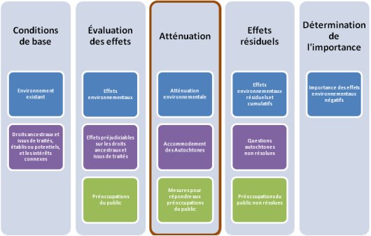 - mesures d'atténuation proposées et les engagements du promoteur (section 11.5) afin d'aborder les effets environnementaux (section 11.1), les droits Autochtones (section 11.2), les préoccupations du public (section 11.3) et le programme de suivi (section 11.4);