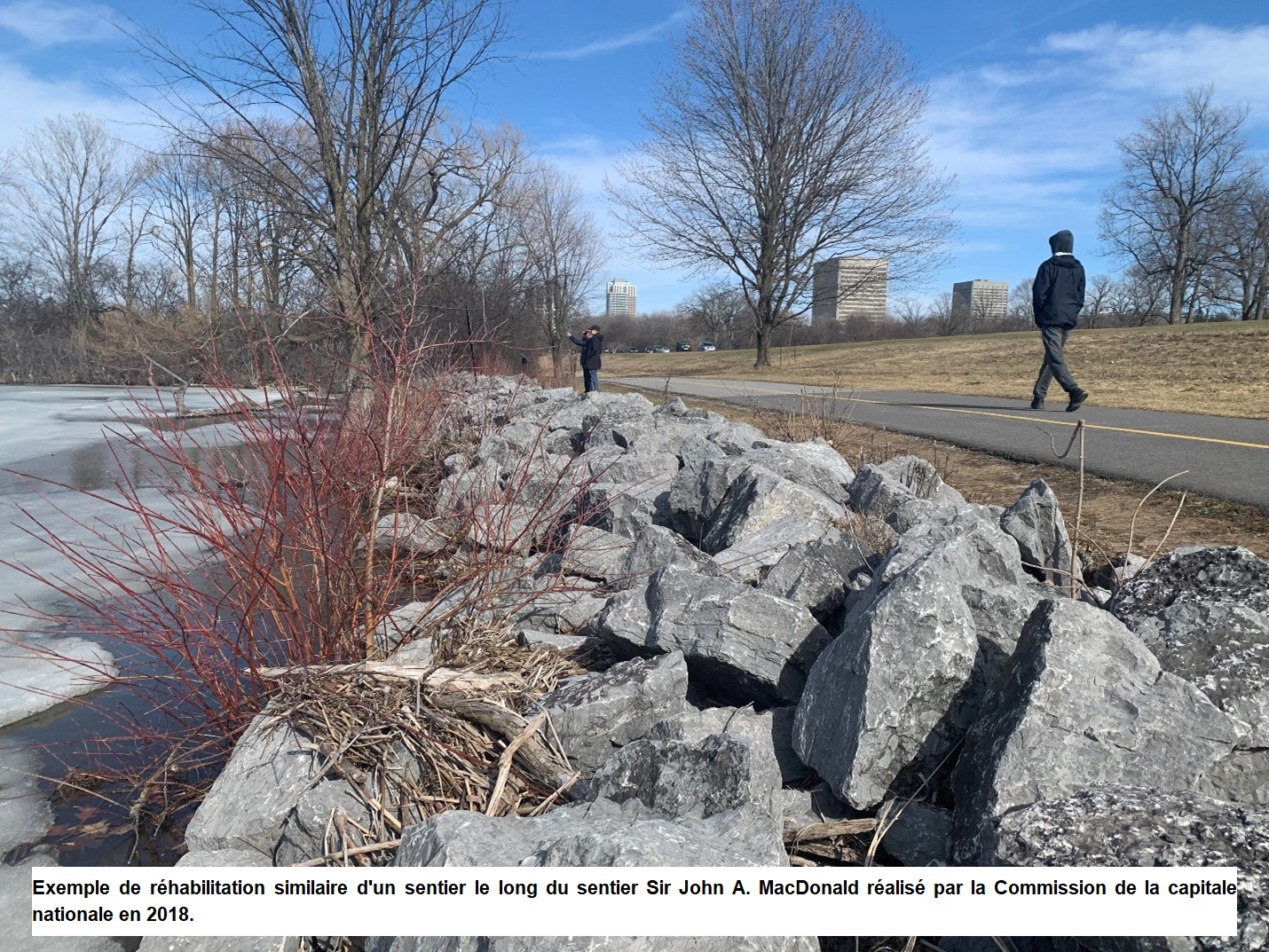 Exemple de réhabilitation similaire d'un sentier le long du sentier Sir John A. MacDonald réalisé par la Commission de la capitale nationale en 2018.